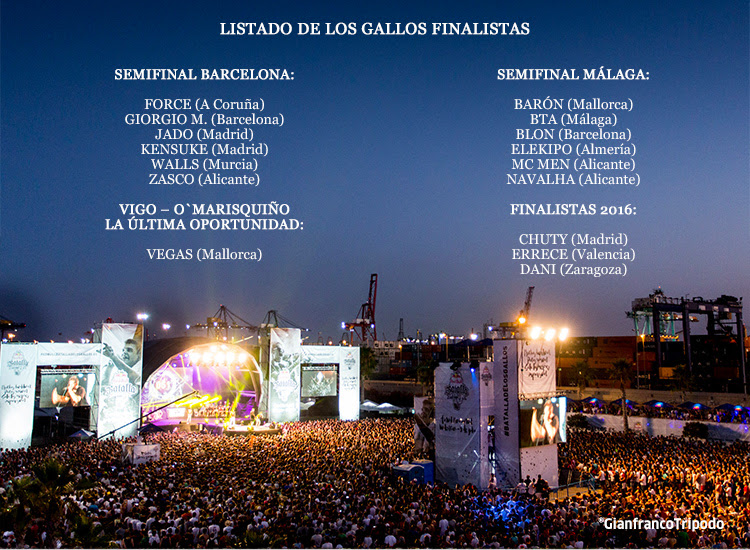 Entre los 30.000 aspirantes al mejor Gallo de 2017, solo 16 MCs finalistas se la jugarán en esta Gran Batalla Final. Al ring se subirán los seis gallos ganadores de la semifinal de Barcelona: Force, Giorgio M., Jado, Kensuke, Walls, Zasco; los seis de la semifinal de Málaga: Barón, BTA, Blon, Elekipo, MC Men y Navalha y el ganador de la ‘Última Oportunidad’ celebrada en el festival de O’Marisquiño de Vigo, el gallo, Vegas. También competirán Errece (semifinalista de la final nacional de 2015), Dani (cuarto puesto en la final nacional de 2016) y Chuty (ganador de la final nacional de 2013 y finalista de 2016).
